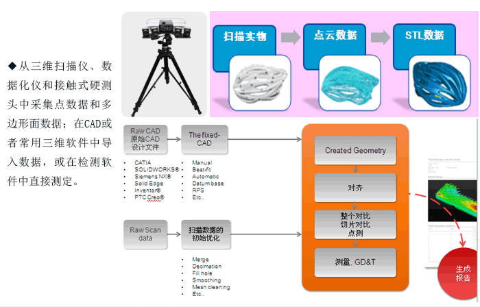 通過(guò)三維掃描儀等采集物體點(diǎn)數(shù)據(jù)和多邊形面數(shù)據(jù),在 3D數(shù)模檢測(cè)軟件檢測(cè)軟件中直接進(jìn)行數(shù)模檢測(cè); 3D數(shù)模檢測(cè)軟件允許導(dǎo)入所有主要的CAD程序原始數(shù)據(jù),如Siemens NX,CATIA V5,Pro / ENGINEER,并且通過(guò)簡(jiǎn)單的工作流程,友好的界面用戶(hù)和精確的計(jì)算,可有效減少人員及降低成本。