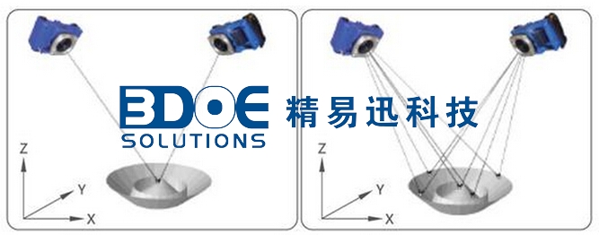 精易迅3DOE Metric三維攝影測(cè)量系統(tǒng)是從兩個(gè)或多個(gè)位置拍攝同一工件,以獲取在不同視角下的圖象,通過三角測(cè)量原理計(jì)算圖象像素間的位置偏差(即視差)來獲取被測(cè)點(diǎn)的三維坐標(biāo)。目標(biāo)點(diǎn)、相機(jī)中心和相點(diǎn)三點(diǎn)構(gòu)成共線方程,然后根據(jù)共線方程結(jié)算出目標(biāo)點(diǎn)的三維坐標(biāo)。
