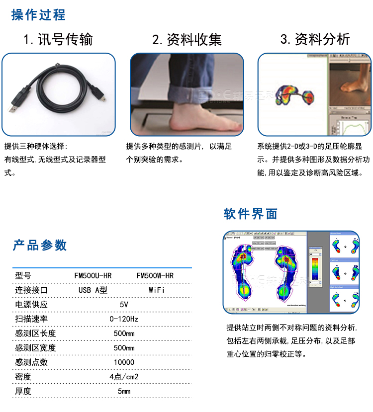 eMat分布測試系統(tǒng)采用高密度足底壓力傳感器和動態(tài)分析軟件,可以準(zhǔn)確的獲取足底站立及行走時各部位的壓力分布, 通過客觀量化的數(shù)據(jù)分析,支持臨床診斷及治療模式。 不同于傳統(tǒng)的測量方法, eMat 可以進(jìn)一步透視足部功能以及生物力學(xué)等參數(shù),也可以鑒別人眼無法分辨的高足壓問題??蓮V泛的應(yīng)用在足部功能分析、步態(tài)分析、姿勢穩(wěn)定性、跌落風(fēng)險評估,運動實驗室、醫(yī)療機(jī)構(gòu)康復(fù)部門、足踝外科及脊柱側(cè)彎矯形等。。