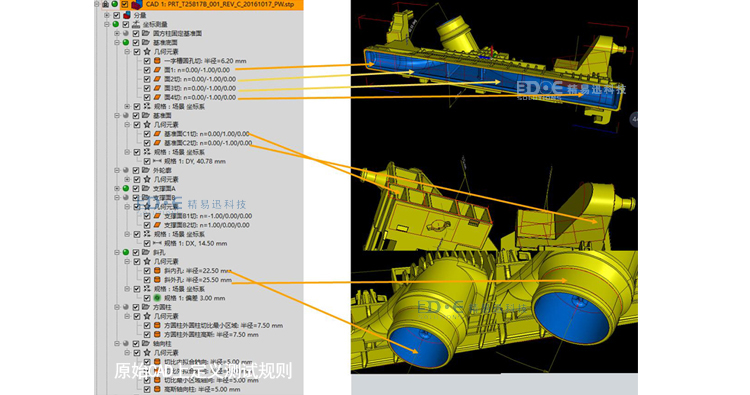 2.把原始CAD數(shù)據(jù)導(dǎo)入到精易迅3D數(shù)模檢測軟件,在原始CAD上定義測試規(guī)則,幾何元素、尺寸、計(jì)算等