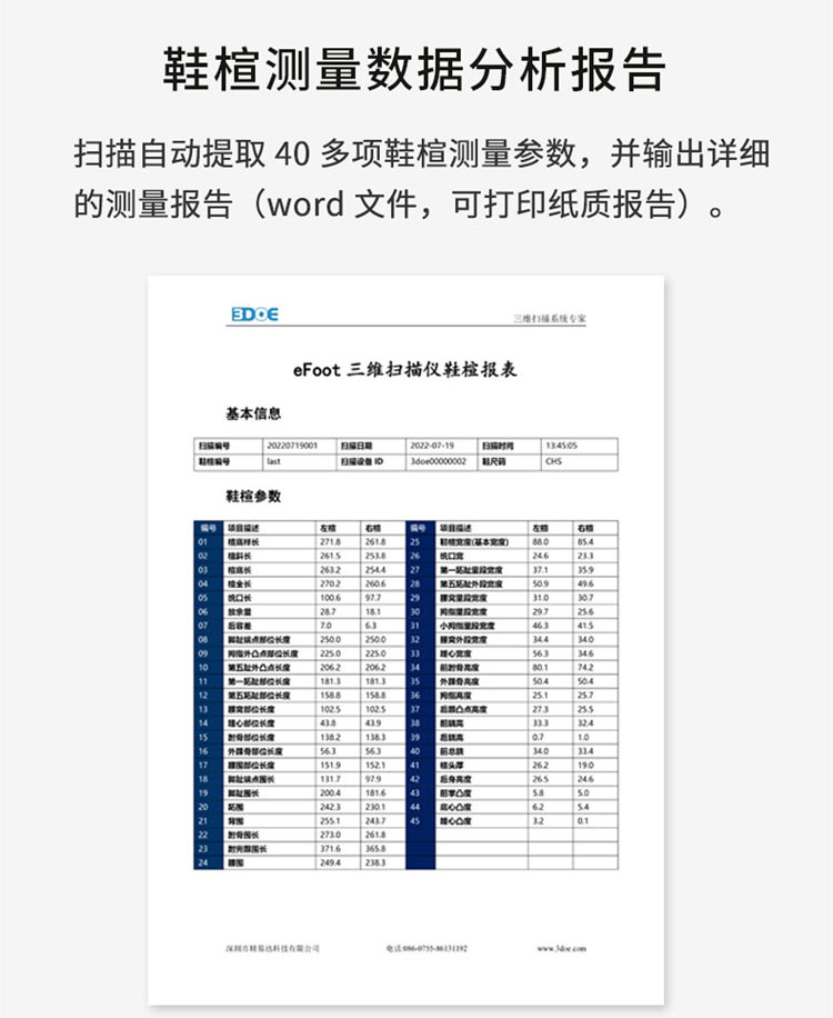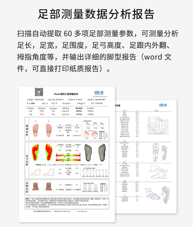 3、60多組腳型數(shù)據(jù)及足弓、內(nèi)外翻等評(píng)測(cè),適合門店、診所等多種報(bào)表格式可定制。
