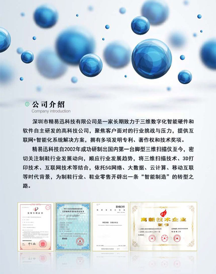 深圳市精易迅科技有限公司,是國(guó)家級(jí)高新技術(shù)企業(yè),長(zhǎng)達(dá)30多年的三維測(cè)量研究和十多年的市場(chǎng)浸染;始于2002年,國(guó)內(nèi)第一臺(tái)三維腳型掃描儀研制商;三維腳型掃描儀發(fā)明專利擁有者;
