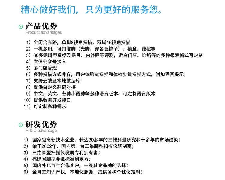 福建省腳型參數(shù)標(biāo)準(zhǔn)制定方;國(guó)內(nèi)外幾百個(gè)合作客戶,一線鞋企品牌的選擇:全自主知識(shí)產(chǎn)權(quán),本地化服務(wù),提供各種個(gè)性化定制;