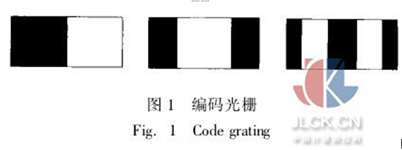 編碼結(jié)構(gòu)光是具有不同節(jié)距的一系列二值光柵,將這3幅光柵投射在物體上,被測(cè)空間被劃分為8個(gè)區(qū)域。如果是n幅光柵,則被測(cè)空間劃分為2n個(gè)區(qū) 域。根據(jù)各個(gè)點(diǎn)在不同圖像中的亮度進(jìn)行編碼,每個(gè)區(qū)域由一個(gè)3位二進(jìn)制編碼表示,有光柵的部分記為“0”,無(wú)光柵的部分記為“1”。這個(gè)編碼是與該點(diǎn)所處 的周期相聯(lián)系的,因此可以由編碼與周期的對(duì)應(yīng)關(guān)系得到被測(cè)物體上柵線的周期分布,從而基本完成相展開過(guò)程。編碼與周期的對(duì)應(yīng)關(guān)系見圖2。根據(jù)被測(cè)空間的大 小以及對(duì)精度的要求,可以靈活調(diào)整投射編碼結(jié)構(gòu)光的數(shù)目,也即調(diào)整周期的數(shù)目。