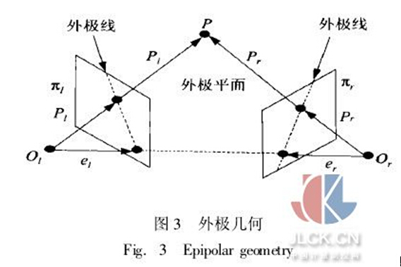 圖3是雙目CCD空間示意圖,稱為外極幾何(Epipolar Geometry)[5]??臻g任意一點(diǎn)P與左右透視中心Ol,Or構(gòu)成一個(gè)平面,稱為外極平面(EpipolarPlane),外極平面與左右像面相交形成兩條外極線(Epipolar Line),也互稱共外極線。對(duì)于交叉擺放的雙目CCD,每一像面上的外極線都相交于一點(diǎn)el,er,即外極中心(Epipole)。由立體視覺(jué)理論可 知,左右像面上任意一對(duì)對(duì)應(yīng)點(diǎn)必然在它們相應(yīng)的外極線上。