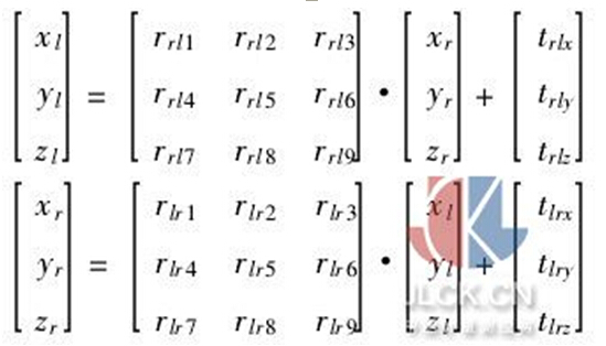 設(shè)左右攝像機(jī)坐標(biāo)系分別為(xl,yl,zl)和(xr,yr,zr),其中Ol,Or為左右攝像機(jī)的透視中心。左右攝像機(jī)坐標(biāo)系變換關(guān)系為: