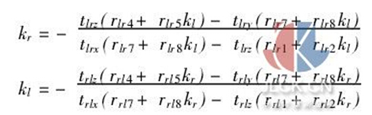 。左像面任意一點(diǎn)Pl在右像面的外極線為外極平面與左像面的交線,同理右像面任意一點(diǎn)Pr在左像面的外極線為外極平面與右像面的交線,并且所有的外極線過(guò)外 極中心,因此可根據(jù)左右攝像機(jī)坐標(biāo)對(duì)應(yīng)關(guān)系求解外極線方程。設(shè)左像面上斜率為kl,并過(guò)el點(diǎn)的直線,在右像面上的外極線斜率為kr,并過(guò)er的直線,推 導(dǎo)出kl到kr的變換關(guān)系和kr到kl的變換關(guān)系[6]: