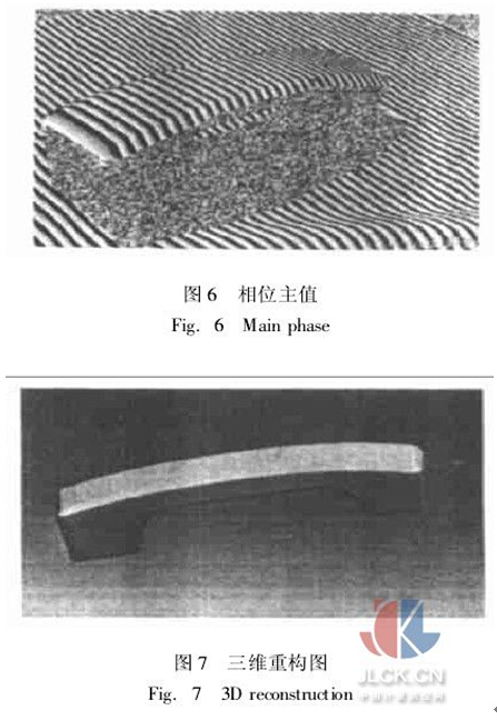 在反向工程中,用本文所述方法對(duì)電話接線筒進(jìn)行三維測(cè)量,以構(gòu)造出它的三維CAD模型。首先對(duì)測(cè)量系統(tǒng)進(jìn)行標(biāo)定,求解攝像機(jī)內(nèi)外參數(shù),如建立攝 像機(jī)坐標(biāo)系與世界坐標(biāo)系的關(guān)系;然后利用投影儀投射編碼光柵和解相光柵于被測(cè)物體,實(shí)驗(yàn)所用的是6幅編碼光柵,即64周期的柵線。圖4是編碼光柵的第1 幅,圖5是解相光柵,圖6是使用解相光柵得到的折疊在[-π,π]之間的相位主值。由相位主值和編碼光柵得到的周期就可以求出真實(shí)相位值,再利用外極約束,即可實(shí)現(xiàn)左右CCD圖像點(diǎn)的匹配。最后是數(shù)據(jù)的后處理工作,利用測(cè)得的數(shù)據(jù)點(diǎn)云在軟件Unigraph-ics18. 0中進(jìn)行三維CAD造型,得到接線筒的三維重構(gòu)圖,如圖7所示。實(shí)驗(yàn)證明了該方法進(jìn)行匹配的可行性和準(zhǔn)確性。