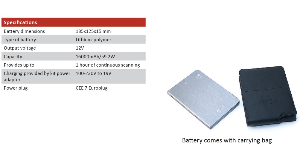 這款電池可以使您不再為無法找到電源而煩惱,可以使您隨時隨地方便操作掃描儀。合理的價格以及簡便的操作令這款電池可以幫助每個人在工作中使用3D掃描儀。只需將掃描儀連接至電池的專用接口就可以開始工作了。為了最大限度地方便使用,電池在工作時可以放置在特殊位置,甚至可以掛在腰帶上。電池的重量很輕,而且尺寸不大(185x125x15 mm),配合掃描儀使用十分方便,甚至在圍繞物體旋轉(zhuǎn)時也不會影響掃描過程。一個標準電池可以保證掃描儀一個小時不間斷掃描的供電。