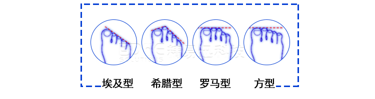 腳型特點(diǎn):羅馬腳比較罕見,這種腳型每根腳趾頭長(zhǎng)度相差不大,基本呈水平,沒(méi)有特別凸出的腳趾,腳背寬,腳趾和前足給人一種正方形的感覺(jué)。