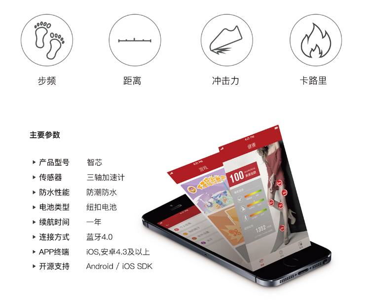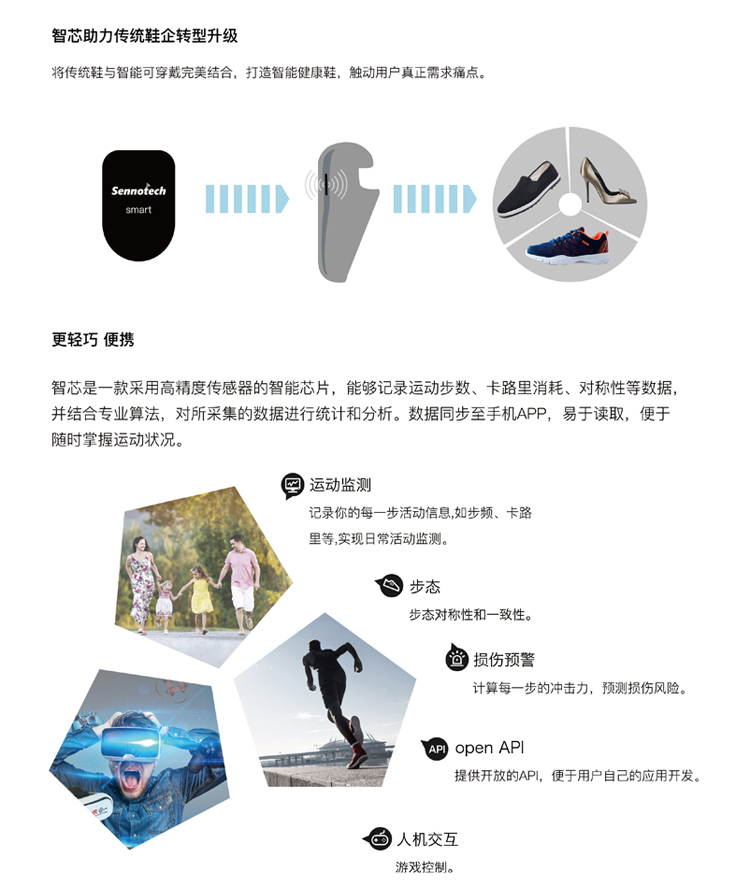 產(chǎn)品描述:Senno smart(智芯)將傳統(tǒng)鞋與智能穿戴完美結(jié)合,打造智能健康鞋,觸動(dòng)用戶(hù)真正需求痛點(diǎn)。智芯是一款采用高精度傳感器的智能芯片,能夠記錄運(yùn)動(dòng)里程、步數(shù)、卡路里消耗數(shù)據(jù),并結(jié)合專(zhuān)業(yè)算法,對(duì)所采集的數(shù)據(jù)進(jìn)行統(tǒng)計(jì)和分析。數(shù)據(jù)同步至手機(jī)APP,易于讀取,便于隨時(shí)掌握運(yùn)動(dòng)狀況